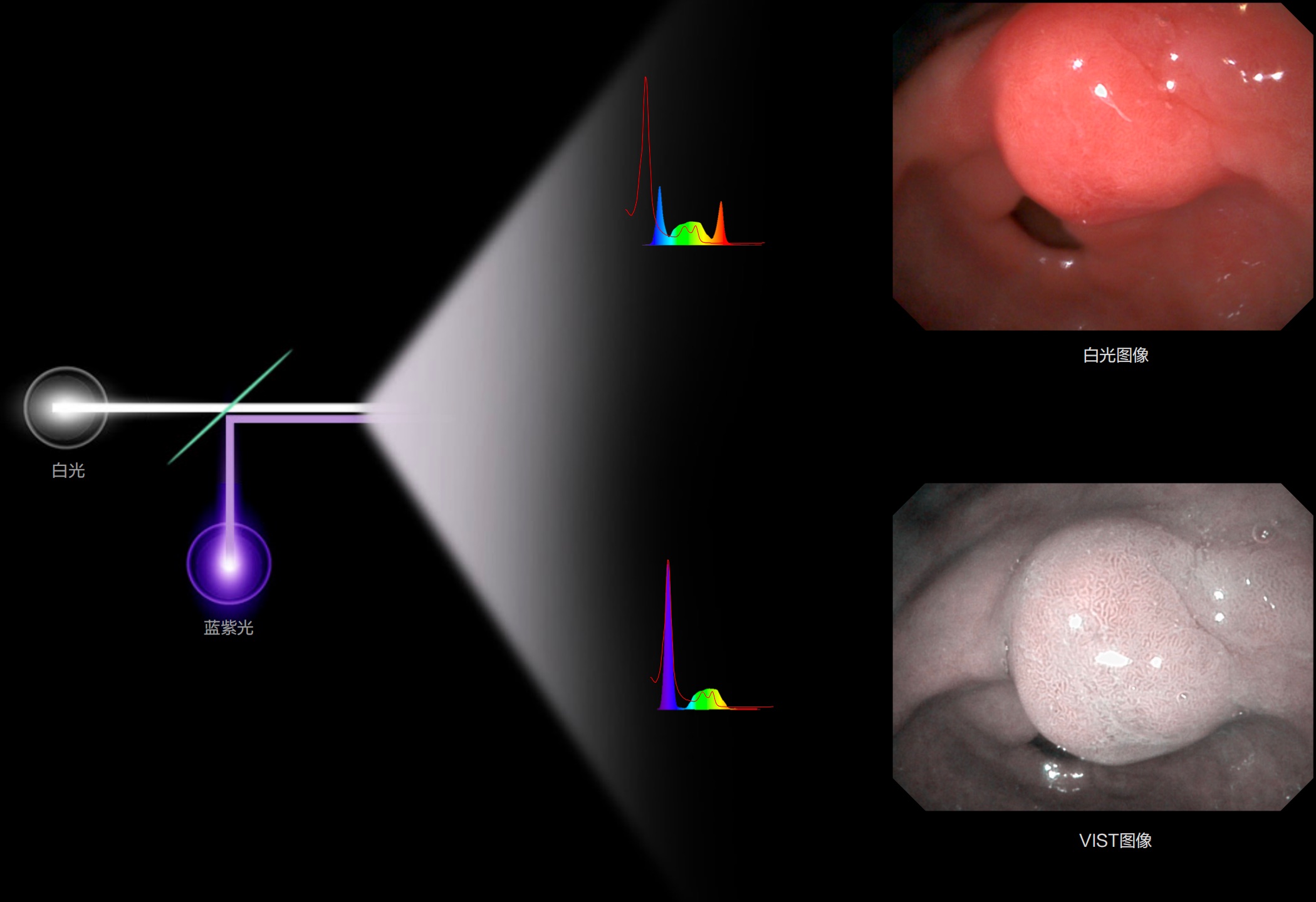 利用了血红蛋白在不同波长吸收下系数不同的原理,设计的一种光学域滤波和数字域滤波结合的染色技术,既保证了图像亮度,又可增强黏膜血管的对比度,充分凸显早期病变的细微结构变化,为临床疾病的观察诊断提供更丰富的参考信息。